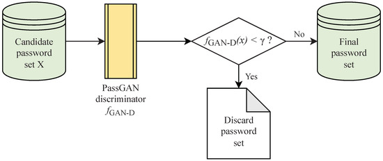 The candidate password set X is used as the input of the PassGAN model discriminator to obtain the score S. The score S and the threshold constant are judged, and the passwords greater than or equal to the threshold constant are selected to form the final password set.