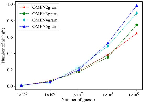 In the legend in Figure 3, OMEN2gram indicates that N in the N-gram of the OMEN model is set to 2. Other legends are similar. The experimental results show that, when N in the OMEN model N-gram was 5, the OMEN model had the best hit performance.