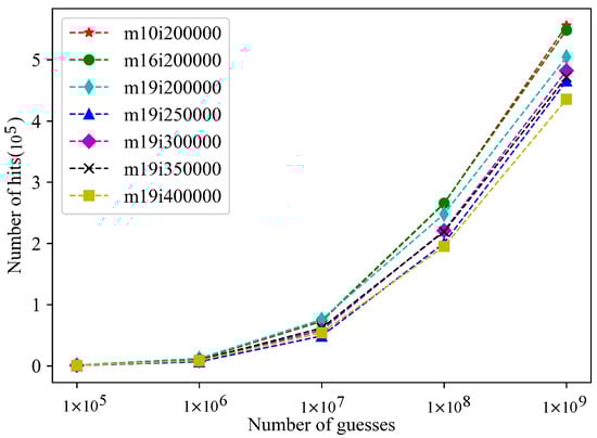 In the legend in Figure 4, m10i200000 means that the maximum sequence length (Sequence_length) of the PassGAN neural-network model is 10, and the maximum number of training rounds (iterations) is 200,000. Other legends are similar. The results show that, when the maximum sequence length of the PassGAN neural-network model is 10, and the maximum number of training rounds is 200,000, the PassGAN neural-network model has the best hit performance.