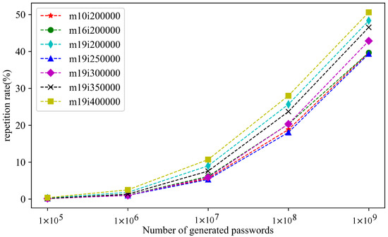 The experiment also counts the repetition rate () of the PassGAN model. The calculation method of the repetition rate is shown as