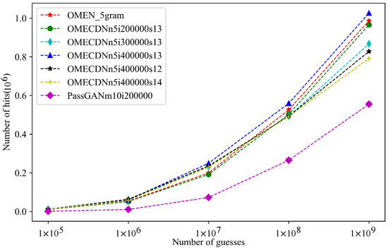 In the legend in Figure 6, OMECDNn5i200000s13 represents the implementation of the password generation module of the OMECDN model. In the N-gram of OMEN, N is 5, the number of training rounds is 200,000, and the score threshold constant is −1.3. The other legends are also the same. The results show that, when the number of training rounds was 400,000 and the score threshold constant was set to −1.3, the OMECDN model had the highest hit rate when the same number of password sets were generated. The specific numbers of hits of the three models are shown in Table 3.