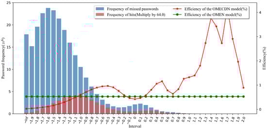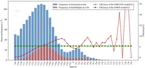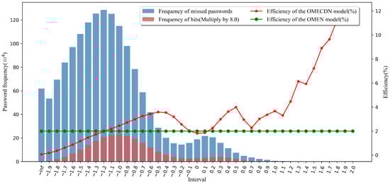The total number of password sets is (for better visualization, we enlarged the height of the red column accordingly, which does not affect the conclusion, and this is enlarged by two times in Figure 8). After understanding the bar graph to indicate the distribution of password scores, we continue to analyze the line graph. The ordinate on the right represents the efficiency of the password guessing model. The calculation method was introduced above. The green line corresponds to the OMEN model (as a reference). When the red line is above the green line, it means that the OMECDN model is more efficient than the OMEN model. It can be seen in Figure 9 that, on the right side of the interval “−1.1”, the efficiency of the OMECDN model is almost better than that of the OMEN model.