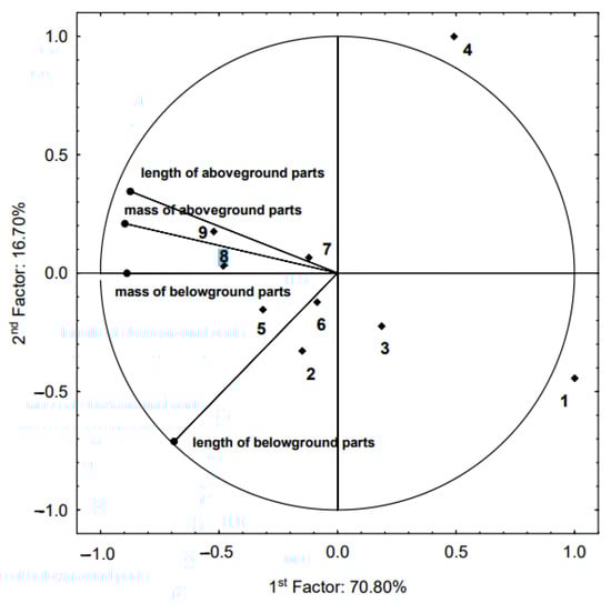 Principal components analysis (PCA) was applied to find dependences between the applied variants of the experiment and the length and weight of the aboveground and belowground parts of the plants (Figure 2). The first principal component explained 70.80% of the variation, whereas the second principal component explained 16.70% of the variation. Both components explained 87.50% of the total variation.