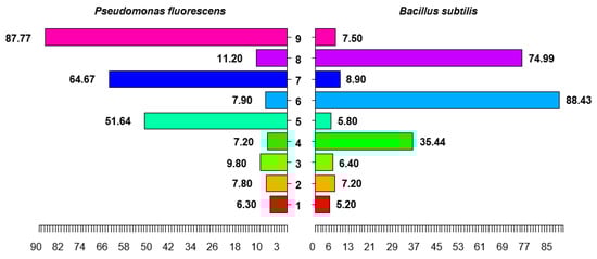 The name PGPR bacteria is more and more often used to describe the bacteria which live in the rhizosphere and colonise plant tissues, thus affecting the growth, development, and productivity of plants. Inoculation with bacterial consortia ensures more balanced nutrition and improves the uptake of nutrients by plants [,]. Among the plant growth-promoting bacteria, Bacillus sp. and Pseudomonas sp. are important and dominant genera, which aggressively colonise the rhizosphere of various crops and exhibit a broad spectrum of antagonism against numerous pathogens []. Plant growth is directly stimulated in various ways, e.g., through the synthesis of phytohormones as well as the stimulation of the growth of the root system. Moreover, PGPR decompose organic compounds and thus provide essential nutrients to plants; they also reduce the level of harmful ethylene [,,].