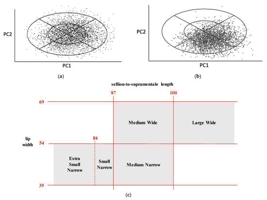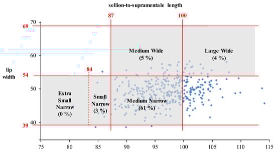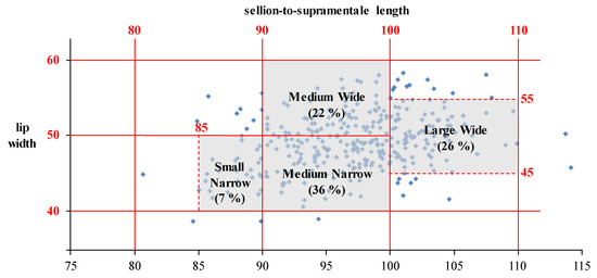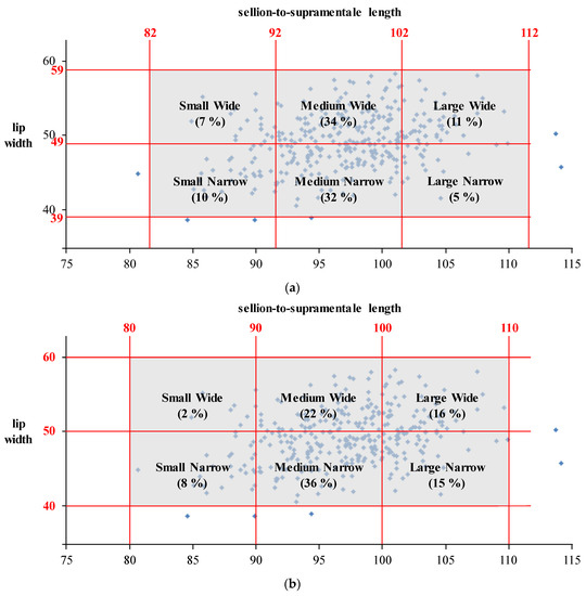 The proposed sizing system was adjusted through a panel of discussion with stakeholders of KAF to consider the economic and managerial efficiencies in military equipment logistics while maintaining a reasonable accommodation percentage. First, the two sizing categories Small Wide and Large Narrow were eliminated from the proposed sizing system as the existing sizing system of the MBU-20/P also does not contain Small Wide and Large Narrow sizes (Figure 1c) based on anecdotal recommendations from the expert personnel in the USAF [10]. The reasons for the exclusion of those two sizing categories from the existing sizing system could include (1) low presence rates of the two sizing categories and (2) economic efficiency for mask manufacturing and logistics after cutting the two sizing categories. For the same reasons, this study excluded Small Wide (presence rate = 2%) and Large Narrow (presence rate = 15%) from the proposed sizing system (Figure 4). Second, the sizing criteria of Small Narrow and Large Wide sizes were adjusted to effectively accommodate the user population with the remaining four sizing categories. The range of SSL of Small Narrow size was set as 85 to 90 mm (initial range: 80 to 90 mm) in order to find a better RFM for the Small Narrow size. The range of LW of Large Wide size was decided to be 45 to 55 mm (initial range: 50 to 60 mm) to accommodate more pilots. The accommodation percentage of the adjusted sizing system was decreased to 90% from 99% but still acceptable to accommodate a sufficient number of Korean pilots. Additionally, the material elasticity (as silicon rubber) of the oxygen mask was considered as it can increase the accommodability [26]. Besides, the economic efficiency of the adjusted sizing system (number of sizing categories = 4) will be comparably better than that of the sizing system having six sizes. The four-category sizing system will have better practicality in terms of managerial efficiency as the sizing category names are the same as the existing ones, but the shapes of each sizing category are dualized if new oxygen masks are used in KAF.