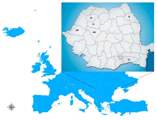 A total of 120 meat samples were investigated by Isotope Ratio Mass Spectrometry (IRMS) and Inductively Coupled Plasma-Mass Spectrometry (ICP-MS) techniques. The sample set consisted of pork (n = 71) and chicken (n = 49) meat samples that were collected from local supermarkets and from different rural regions in Romania (Figure 1). The samples were placed in plastic bags and stored in the fridge for less than 24 h prior to being prepared for the subsequent analysis. Some of the samples were collected directly from the yard of pig and chicken farms located in rural regions (33 chicken and 24 pork meat samples). A total of 16 chicken and 47 pork meat samples were acquired, according to the label, from different industrial farms in Romania.