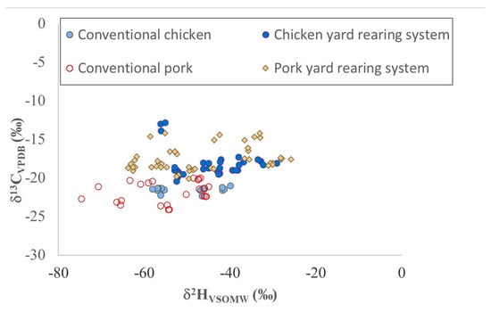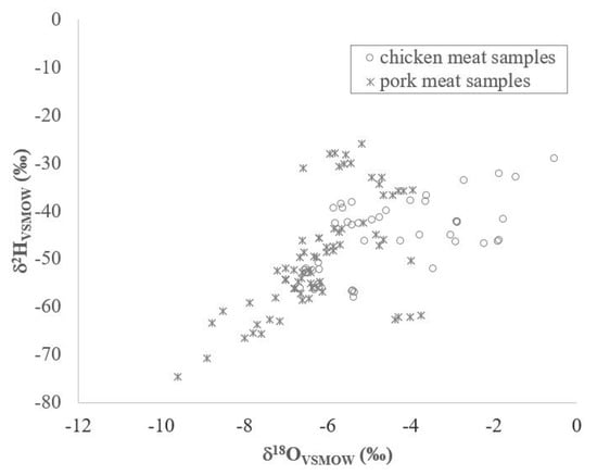 It is a well-known fact that δ2H and δ18O are tracers for geographical origin because the chicken and pork body water takes its rise from drinking water, which in turn depends on latitude, altitude, and distance from the sea [], reflecting a region-specific distribution [].