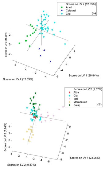 It was not surprising to find Na among the primary parameters in geographical origin differentiation. Sodium was also found as a discriminator marker for Transylvanian pork meat [] and vegetables [], due to the fact that this region is recognized as having a higher Na content in the soil. Soil characteristics differ among different regions. Thus, the concentration and availability of minerals in soil are reflected in plants, and then in the animals that consume the plants. Arsenic was identified as a predictor for the geographical origin assignment of Romanian honey [], potatoes grown in distinct regions of Romania [], and the authentication of Transylvanian fruit spirits [].