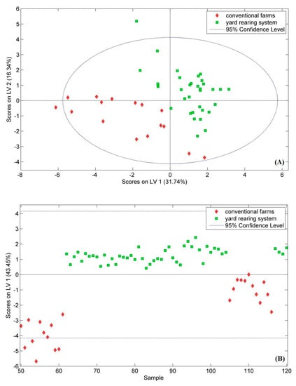 PLS-DA score plot obtained for meat sample discrimination based on animal growing system: (A) chicken and (B) pork.