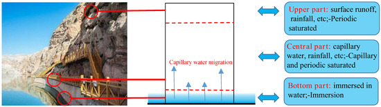 Different parts of the grottoes, cliff statues, and other cultural relics are in different surroundings. As shown in Figure 1, the bottom of the cultural relic is immersed in water for a long time due to the influence of groundwater and surface runoff. The lower regions suffer from capillarity, while the upper regions are saturated when affected by rainfall and snowfall.