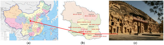 Rock sampling site: Qingyang, Gansu, China. (a) Map of China; (b) map of Qingyang; (c) north Grottoes.