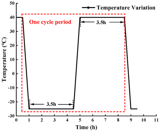 The temperature control cycle of the freeze–thaw test is as follows: cooling from 40 °C to −25 °C using 0.5 h, and freezing for 3.5 h; heating from −20 °C to 40 °C using 0.5 h for 0.5 h, and melting for 3.5 h. One cycle lasts 8 h, and the temperature change is shown in Figure 5. To ensure the test indexes can be referred to, in the experiment, two test conditions were set for nondestructive indexes such as surface hardness and wave velocity: (1) the rock samples are placed in an environment with a temperature of 25 °C and humidity of 60% for more than 48 h (simulated in situ test conditions); (2) the rock samples are dried (laboratory test conditions).