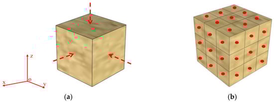 Generally, the degree of weathering can be evaluated by nondestructive or destructive testing [15]. As a destructive test, uniaxial compressive strength (UCS) could directly reflect the mechanical properties of degraded rock, and it can be used as a reference for the non-destructive tests. In this experiment, electronic Hydrostatical balance (Shunyu JA5003, Yuyao, China) was used to determine the mass of the samples and calculate water absorption and porosity. A Leeb abrasion tester (Botech BH200C, Guangzhou, China), non-metallic ultrasonic detector (Koncrete NM-4B, Beijing, China), and universal testing machine (Kexin CSS-WAW 1000DL, Changchun, China) were applied, respectively, to measure the surface hardness, ultrasonic wave velocity, and UCS. The scanning electron microscope (Hitachi S-3000N, Tokyo, Japan) was used to analyze the micro-topography of the samples. The cube rock sample is convenient for testing the surface hardness and wave velocity in multiple areas and directions. For example, the wave velocity values were measured from three directions in space, the surface hardness was measured for 27 areas on three surfaces, and the mean values of the measured values were taken for analysis. The schematic diagram of the test is shown in Figure 6. The indexes of fresh yellow sandstones are shown in Table 2.