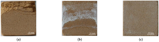 The differences in rock samples under different freeze–thaw conditions can be seen from the macroscopic morphology during the tests, as shown in Figure 7. The damage to rock samples under immersion freeze–thaw is the most serious. Rock samples are damaged from the edges and corners, cracks continued to develop along the bedding, particles kept peeling off, and other parts of the rock suffered minor damage. Some rock samples are seriously damaged after 40 cycles. The rock sample as a whole is no longer intact and completely damaged after 80 cycles. The rock samples in the capillary freeze–thaw test showed salt precipitation gradually. After 10 cycles, layered destruction occurred about 2 mm from the bottom, indicating that salt still existed after desalting treatment. Cultural relics in the open air were generally still subjected to salt weathering, the bottom water content of the capillary rock was high, and the damaging effect of freeze–thaw was stronger. In the periodic saturated freeze–thaw test, the macroscopic morphology of rock samples did not change significantly within the testing cycle range, and the touch sensation became rough. A small number of particles peeled off at the edge of rock samples, and the edges and corners became uneven, with slight damage in local areas.