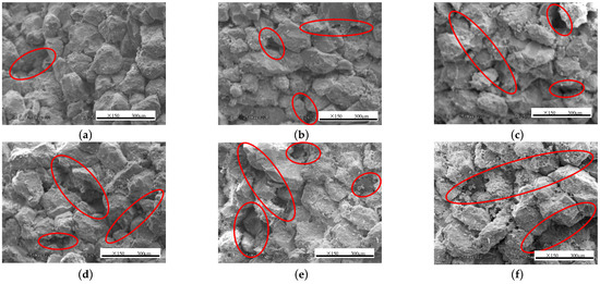 Microscopic morphology changes of rock samples with capillary freeze–thaw cycles: (a) 5 cycles; (b) 10 cycles; (c) 20 cycles; (d) 40 cycles; (e) 60 cycles; (f) 80 cycles.