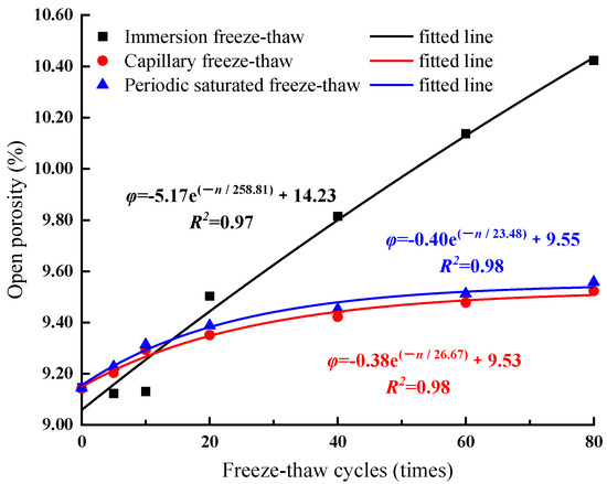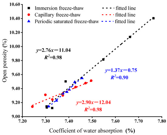 Due to the expansion force caused by pore water freezing or the tension caused by different shrinkage coefficients of each component of the rock sample in the cooling process, the pore size of the rock sample becomes larger, and at the same time, micro-cracks are generated, connecting unopened pores, and the porosity of open pores increases. Figure 10 is the fitting curve of the porosity of the rock sample. With the increase in freeze–thaw cycle times, the porosity of rock samples increases rapidly in the early stage but decreases in the later stage, presenting a logarithmic growth trend. The porosity of the rock samples with 80 freeze–thaw cycles increased to 10.41%. However, the porosity of open pores in capillary and periodic saturated freeze–thaw rock samples is about 9.50%. Water absorption is also an important indicator to reflect the development of rock pores and fractures, and it is easier to measure water absorption in field tests. In this paper, water absorption and porosity are correlated, as shown in Figure 11. It can be seen that there is a good linear correlation between water absorption and open porosity, indicating that the water absorption test can adequately characterize the open porosity of the rock, but the correlation coefficient between the two is different under different freeze–thaw methods, and the water absorption measured on site needs to be calibrated to accurately determine the porosity of rock opening.