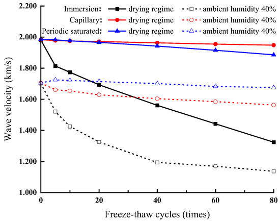 Under the preset environment, the wave velocity of the rock sample in the test generally shows a downward trend, as shown in Figure 12. Compare the wave velocity values under the dry state and the preset environment state. The wave velocity of the rock sample under the preset environment is smaller than in the dry state. Because freezing–thawing results in the expansion of rock fissures and the relative increase in rock moisture content, while the wave velocity propagates at a lower speed in the water. Meanwhile, water leads to refraction and energy loss when the wave propagates in porous media. The attenuation law of wave velocity is different under the two test conditions, which means that the water content of rock should be considered when evaluating the degree of weathering of rock by wave velocity [17]. It is true that some stone cultural relics in the open air have a huge volume, and the water content of different parts will be different. This paper only discusses the changes in wave velocity in two representative states of rock.