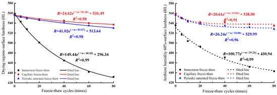where a, b, and c are constants, R is the value of surface hardness, and n is the number of freeze–thaw cycles.