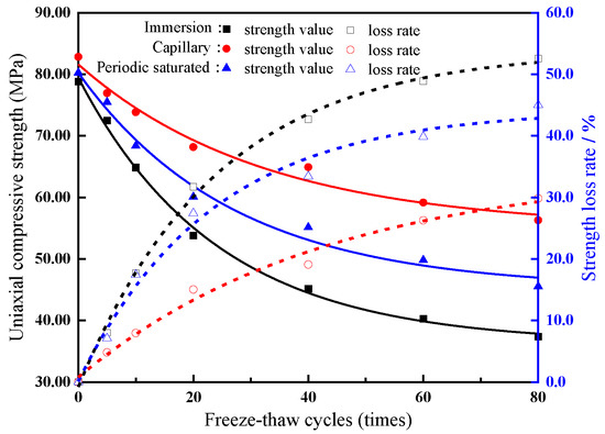 The uniaxial compressive strength (UCS) is an intuitive mechanics index of rocks, and its variation curves and loss rate with the number of freeze–thaw cycles are shown in Figure 14. UCS decreases exponentially with the increase in freeze–thaw cycle times, while the strength loss rate increases exponentially. The attenuation degree of UCS of rock samples in different freeze–thaw modes is different. The strength attenuation of the first 20 freeze–thaw cycles is the fastest, accounting for about 60% of the total attenuation amount, indicating that the sandstone with a better initial state under freeze–thaw action has a faster deterioration rate. With the deepening of the degree of weathering, the deterioration rate of rock samples with the same freeze–thaw cycle times gradually slows down.