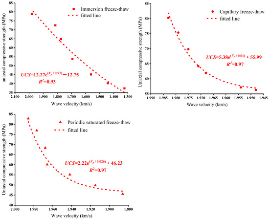 In this study, nondestructive indexes were taken as independent variables and strength parameters were taken as dependent variables to establish functional relationships among indexes. In a certain range, the more serious the internal deterioration of rock, the more significant the pore development, the smaller the ultrasonic wave velocity, and the lower the UCS. Wave velocities and UCS of each series of rock samples were fitted, as shown in Figure 15. There is an exponential relationship between wave velocity and compressive strength: