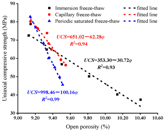 The curves in Figure 13 show that there is a linear correlation between open porosity and UCS of rock samples under freeze–thaw action, and its variation trend is in line with the functional relationship of Equation (3):