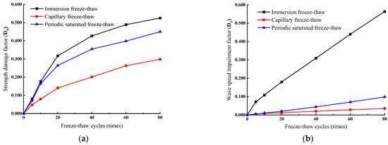 - Damage variable evaluation is an important analysis to measure the irreversible deterioration degree of rock materials. The weathering degree of rock samples undergoing the same cycle times is different, among which the damage degree of immersion freeze–thaw is the highest, followed by periodic saturated freeze–thaw, and the damaging effect of capillary freeze–thaw is the least. This is consistent with the overall results of the experiment.