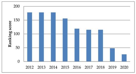 Since 2012, the Russian Federation has participated in the World Bank’s Doing Business score, namely, in its “Dealing with Construction Permits” section. It enables to assess the results of measures taken to optimize procedures annually (Figure 1). Over 8 years, Russia has risen in the ranking from the 178 to the 26th position, which shows the positive dynamics of procedures and their optimization. It is noteworthy that, during this period, both the number of procedures and the time to execute them have decreased (more than twice) [1,2,3,4,5,6,7,8].