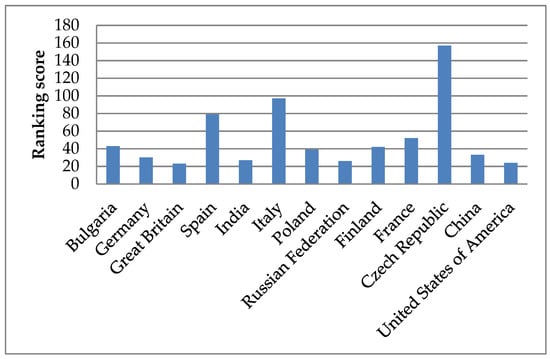 The task of reducing excessive administrative barriers and improving the entrepreneurial climate in construction is set not only by the Russian Federation but also by many countries. Figure 2 shows the ranking score of a number of countries, such as Bulgaria, the Czech Republic, China, Great Britain, India, Finland, France, Germany, Italy, Poland, Spain and the United States of America, in obtaining construction permits for 2020.