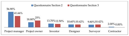 To confirm the validity of the results of the expert examination, the requirements for the experts’ qualification were formulated [36,37]: representatives of the project manager (not less than 50% of the total number of experts), investor, designer and surveyor; general construction experience of more than 5 years and higher education. The sphere of project implementation—representatives of the state-owned enterprises (40–60% of the total number of experts) and commercial ones (40–60% of the total number of experts).