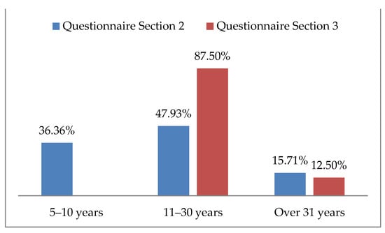 The first phase of the survey involved 121 experts, whereas the second phase involved 24 experts, correspondingly. The experts met the preset requirements, which was confirmed by the results of the processing of “Section 1. General Issues” of the questionnaire (Figure 3, Figure 4, Figure 5 and Figure 6).