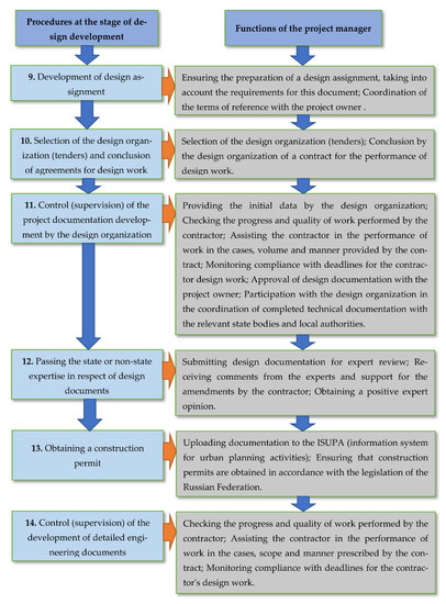 Based on the results of the analysis of the scientific and technical literature and current legislative regulations, the main functions of the project manager were specified and grouped into a system of consolidated procedures (Figure 7, Figure 8 and Figure 9) [38,39,40,41,42,43,44].