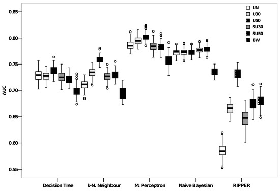 Thus, Figure 1 depicts the box-plots of the corresponding AUC values for the first six strategies. The white box-plots correspond to the UN strategy, the light gray box-plots to the U30 strategy, the light gray box-plots with a pattern of black dots to the U50 strategy, the dark gray box-plots to the SU30 strategy, the dark gray box-plots with a pattern of black dots to the SU50 strategy and the white box-plots with a pattern of black dots to the BW strategy.