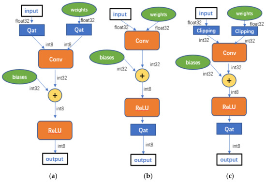 Demonstration of training-aware quantization, post-training quantization, and clipping-based post-training 8-bit quantization. (a) Training-aware quantization. Both input and weights are quantized and the model is trained the quantized to 8-bit number. (b) Post-training quantization. The input and weights are pseudo-quantized to 32-bit integer for training and further quantified after training. (c) Clipping-based post-training 8-bit quantization. The input and weights are pseudo-quantified and clipped to a predesigned range, and then further quantified after training.