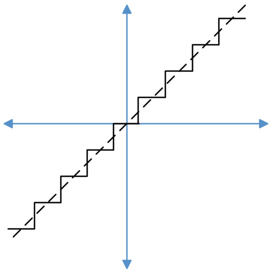 In backpropagation, since is a discrete value, the second term in (formulas (3) and (4)) is non-derivable. To solve this problem, researchers proposed a straightforward estimator [16] (STE), as shown in Figure 2. The stepwise function in Figure 2 represents a common uniform quantization method, and its gradient is normally difficult to find. STE is actually a sign function that takes 1 when the gradient of the stepwise function is greater than or equal to 0, so that the gradient here can be regarded as 1. By doing so, the quantization function becomes an identity mapping f(x) = x for backpropagation.