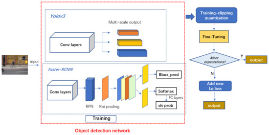 At present, object detection algorithms based on convolutional neural networks can be divided into two categories: one-stage object detection and two-stage object detection algorithm. The one-stage object detection algorithm is based on convolutional networks. The feature map directly returns the location of the target, and the model further classifies the target categories. The representative works are SSD [17] and YOLO [18,19,20,21] series. In two-stage target detection algorithms, the first stage is to generate region proposals, and the second stage is to return to the target location and classify the target category based on the regional proposal, which is represented by the R-CNN [22] series algorithms, including R-CNN, Fast R-CNN [23], Faster R-CNN [24], and mask R-CNN [25]. This paper takes a one-stage mature representative network, YOLOv3, and a two-stage representative network, Faster R-CNN, for validating the effectiveness of our designs The process and experimental design of the clipping-based post-training 8-bit quantization method are shown in Figure 3. As shown in Figure 3, we apply our clipping base quantization method to two representative one-stage, two-stage target detection networks. After fine-tuning, we check whether the accuracy loss meets the expectation, and if the accuracy still decreases, we adjust the loss function considering the loss of clipping operation to obtain the result.