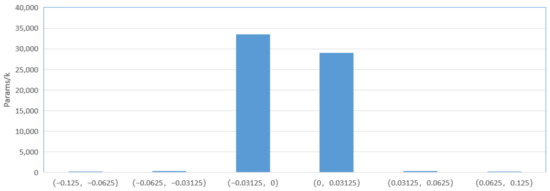 The weight value is static and can be obtained by training. We obtained the range of model weight from the original models, as shown in Figure 7. It can be found that the weights of the convolution layer are distributed between [–1, 1], mainly concentrated in [−0.0625, 0.0625]. The total number of network parameters is 62,944,352, of which 99.2% of the parameters are located between [−0.03125, 0.03125], and 0.67% of the parameters are between [−0.0625, −0.03125] and [0.03125, 0.625].