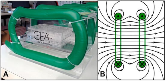 In vitro PEMF chamber consisting of (A) two electromagnetic Helmholtz coils (green) that create a (B) uniform magnetic field in the culture region.