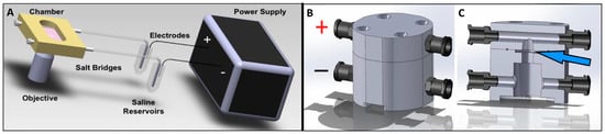 The galvanotaxis system (Figure 2A) was constructed following a flow chamber assembly []. Silver–silver chloride electrodes were fabricated from silver wire and soaked in a hypochlorite solution (Clorox Bleach) for 1 h. Electrodes were connected to ports on both sides of the galvanotaxis channel using a pair of 2% agarose–PBS bridges. These bridges prevented cell contamination from electrolysis products generated during EF stimulation using a power supply (Keithley Instruments, Cleveland, OH, USA), which delivered a current of 3.3 mA (6 V/cm EF strength) []. The conductive media that flowed through the galvanotaxis chamber system was Dulbecco’s Modified Eagle’s Medium (DMEM; Cat. No. 12100046; Thermo Fisher Scientific, Waltham, MA, USA) supplemented with 5% fetal bovine serum (FBS; Cat. No. S11550; R&D Systems, Minneapolis, MN, USA), which had adequate protein concentration for cellular adherence as well as ion concentrations for current flow. Galvanotaxis DC EF stimulation was applied for 3 h at room temperature. The chamber also consisted of a glass panel, allowing for microscopic analysis of cellular migration.