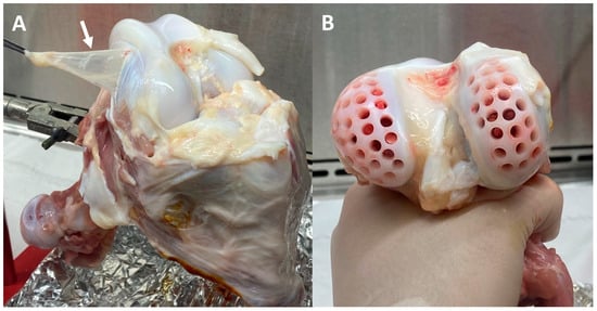 Juvenile bovine knee explant harvest. (A) Synovium (arrow) was harvested from the medial and lateral femoral condyles of the joint. (B) Osteochondral grafts were collected using a 4 mm biopsy punch from the femoral condyle.