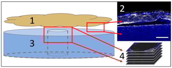 To form a cartilage defect, 1 mm cores were removed from each 4 mm bovine cartilage plug using a trephine biopsy. The obtained ~1 cm × 1 cm pieces of bovine synovium were stained using a lipophilic membrane dye (Vybrant DiI; Life Technologies, Carlsbad, CA, USA). Synovium samples were oriented in direct apposition to the cartilage explant (Figure 4), covering the 1 mm defect region, prior to PEMF or DC EF stimulation. The cartilage plug with the overlying synovium sheath was cultured in DMEM supplemented with 5% FBS, 1% AA, and 50 μg/mL ascorbic acid-2-phosphate. Explants were separately placed in the PEMF and galvanotaxis chambers (n = 6). Control samples were handled similarly, but without the application of electrical stimulation. PEMF chamber was active for 8 h per day and explants were treated for 48 h []. The galvanotaxis EF current was applied for 3 h, generating an applied field strength of E = 6 V/cm (EF) [].