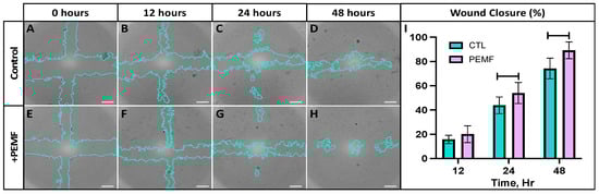 Representative images from in vitro wound healing assay demonstrating FLS migration into the cell-free region (blue) for (A–D) control and (E–H) PEMF treated samples (Scale bar = 100 μm). (I) Quantified percent wound closure of control and PEMF exposed FLS at 12, 24, and 48 h following initial cruciform injury (n = 6 per treatment condition).