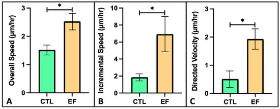 Effect of DC EFs on (A) overall speed, (B) incremental speed, and (C) directed velocity of bovine FLS within a 3D collagen hydrogel (* p < 0.001). Parameters were determined by following the path of individual cells for both CTL (n = 20 cells) and EF treated (n = 24 cells) groups.