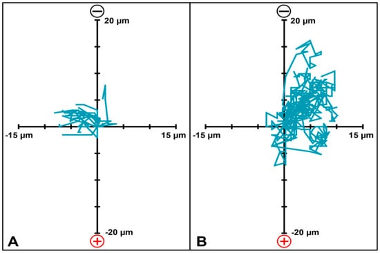 Individual migration paths for (A) CTL (n = 20) and (B) EF (n = 24) treated FLS within the 3D collagen gel. Tracking of each cell began at the origin, with positive y-displacement indicating cathodal migration.