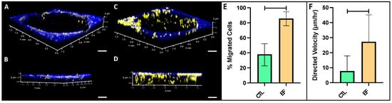 DC EF stimulation via galvanotaxis increased cell recruitment and migration within the bovine cartilage defect (Figure 8C,D) compared to controls (Figure 8A,B). Assessing the depth of the defect region following DC EF exposure, approximately 86% of adherent cells had migrated at least 40 μm in the EF group, compared to 38% in the controls (Figure 8E; p < 0.001). Additionally, EF stimulation increased the directed velocity of FLS into the defect site (28.2 μm/h) relative to untreated controls (8.9 μm/h) (Figure 8F; p < 0.001).