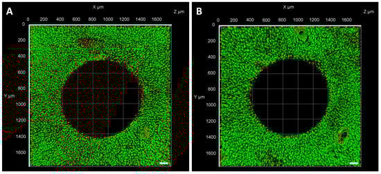 Representative live/dead images of (A) control and (B) DC EF treated cartilage explants following DC EF stimulation for 3 h (Scale bar = 100 μm).