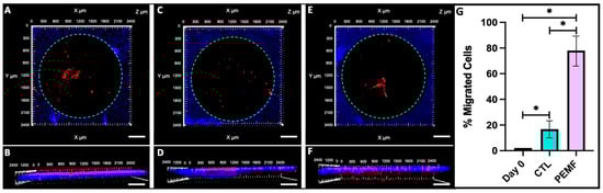 Representative confocal images of DiI-stained FLS migrating into DAPI-labeled cartilage defect. (A) Top and (B) side view of day 0 samples showing no FLS migration. (C) Top and (D) side view of control group (CTL) without PEMF stimulation for 48 h showing minimal cell migration (E) Top and (F) side view of explant exposed to PEMF for 48 h showing significant migration through the cartilage depth (Scale bar = 200 μm). (G) Quantified cell count of FLS migration into the cartilage defect across day 0, CTL, and PEMF treated explants (* p < 0.001).