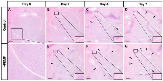 H&E-stained bovine cartilage explants to assess defect repair for (A–D) control and (E–G) PEMF treated samples (Scale bar = 300 μm). A uniform defect region was formed by removing 1 mm subcores and reinserting the annuli into the cartilage explant. Arrows indicate areas of closure along the cell-free defect region.