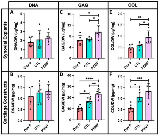 In bovine synovium and cartilage explants, no significant changes in DNA levels were observed between PEMF treated groups and controls (Figure 12A,B). Synovium exposed to PEMF exhibited a 37% increase in GAG content compared to untreated day 7 samples (Figure 12C; p = 0.0406). In cartilage constructs, the difference in GAG was slightly more profound for PEMF treated explants with an overall increase of 40% relative to day 7 controls (Figure 12D; p = 0.0076). Compared to explants collected during initial harvest (day 0), PEMF exposed synovium exhibited a 45% increase in GAG levels (p = 0.0173). Both day 7 controls and PEMF treated cartilage explants also had significantly elevated GAG compared to day 0 samples (p = 0.0101 and p < 0.0001, respectively). Synovium under PEMF treatment also exhibited a 66% increase in collagen content compared to day 7 controls (p = 0.0103), while no significant changes were observed between the same treatment groups for the cartilage explants (Figure 12E,F). Compared to day 0 specimens, a greater than 2-fold increase in collagen levels was observed for both synovium and cartilage tissue under PEMF stimulation (p = 0.0016 and p = 0.0003, respectively). In cartilage explants, an 87% increase in collagen levels were also measured in day 7 controls compared to day 0 samples (p = 0.0117).