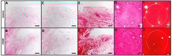 Histological staining of PEMF treated synovium and cartilage explants yielded similar results. Similarities in synovial structural morphology between PEMF and control samples were visualized with H&E (Figure 13A,B). Slightly deeper staining of Safranin O was observed in both PEMF treated synovial and cartilage explants compared to untreated controls (Figure 13C,D,G,H). Higher intensity Picrosirius Red staining was also evident in synovium exposed to PEMF stimulation (Figure 13E,F), while no visual differences were observed between the cartilage constructs (Figure 13I,J).