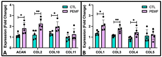 Gene expression of bovine cartilage explants normalized to day 0 controls using (A) cartilage (ACAN, COL2, COL10, COL11) and (B) synovium (COL1, COL3, COL4, COL5) ECM markers following 7 days of PEMF stimulation with parallel untreated controls (n = 6; * p < 0.05, ** p < 0.01).